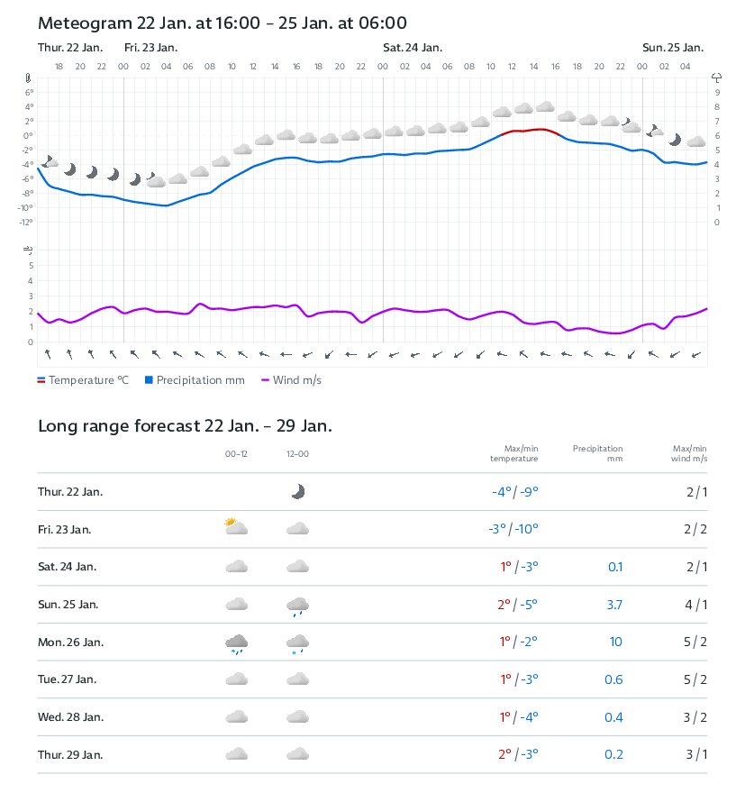 | ▼ -1 °C | | 💨 7 m/s | | 💧 16.5 mm | | ❄ 8.9 cm | |