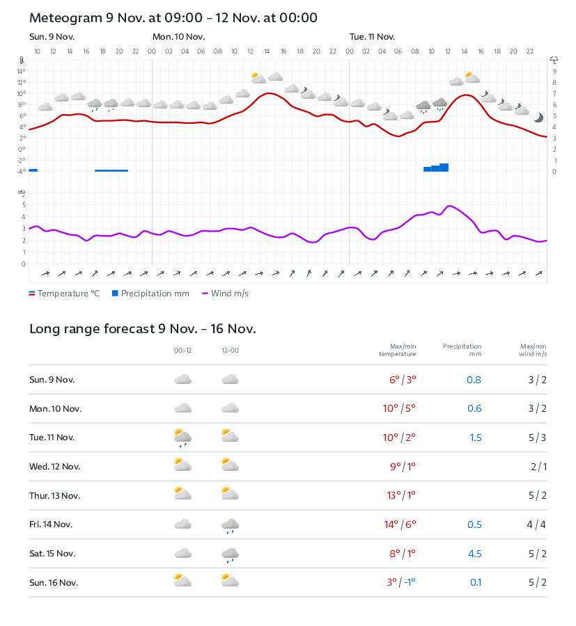 Většinou polojasno. Zejména na severu a severozápadě kraje místy mlhy nebo nízká oblačnost, která se výjimečně udrží po celý den. Nejnižší noční teploty 4 až 1 °C, při zmenšené oblačnosti kolem 0 °C. Nejvyšší denní teploty 8 až 11 °C, při déletrvající nízké oblačnosti kolem 6 °C. Slabý proměnlivý nebo vítr z jižních směrů do 3 m/s nebo klidno. | |