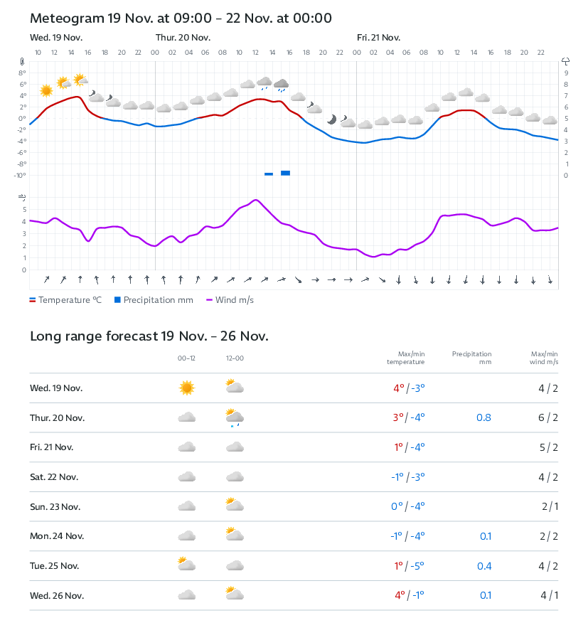 Zataženo až oblačno, na severozápadě kraje zpočátku i polojasno. Nejnižší noční teploty -3 až -6 °C. Nejvyšší denní teploty -2 až +1 °C. Většinou mírný severozápadní až severní vítr 2 až 6 m/s. | |