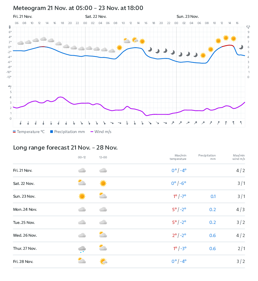 Zataženo až oblačno. Od západu místy sněžení, během dne pod 500 m déšť nebo déšť se sněhem. Ojediněle srážky mrznoucí. Nejnižší noční teploty -3 až -6 °C. Nejvyšší denní teploty 0 až 3 °C. Slabý, během dne místy mírný jihovýchodní až jižní vítr 2 až 5 m/s. KOMENTÁŘ METEOROLOGA: Ojediněle tvorba ledovky. | |
