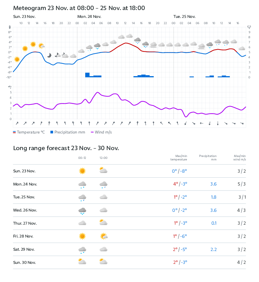 | ▼ -7 °C | | 💨 5 m/s | | 💧 0.8 mm | | ❄ 0.9 cm | |