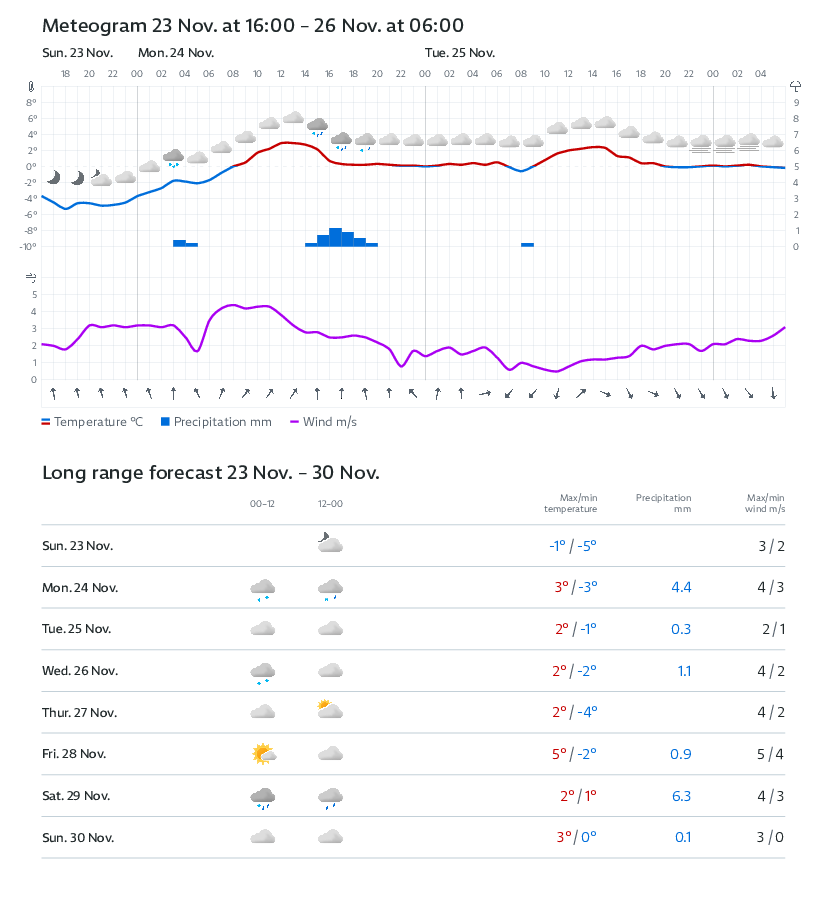 Zataženo až oblačno, na většině území sněžení, v polohách pod 500 m přechodně i srážky smíšené nebo dešťové. Odpoledne a večer ubývání srážek. Nejnižší noční teploty +1 až -2 °C. Nejvyšší denní teploty 0 až 3 °C. Mírný severozápadní vítr 2 až 6 m/s. | |