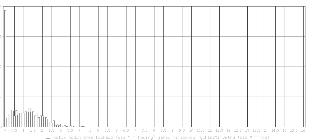 Průměrná rychlost větru za poslední minutu byla 0.7 m/s Dnes nárazy větru od 0.00 m/s (0 km/h) do 4.22 m/s (15.1 km/h)