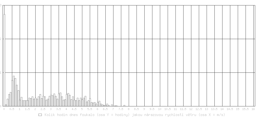 Průměrná rychlost větru za poslední minutu byla 0 m/s Dnes nárazy větru od 0.00 m/s (0 km/h) do 7.29 m/s (26.2 km/h)