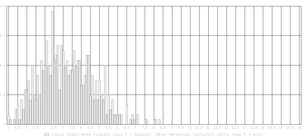 Průměrná rychlost větru za poslední minutu byla 3.5 m/s Dnes nárazy větru od 0.03 m/s (0.1 km/h) do 8.03 m/s (28.9 km/h)