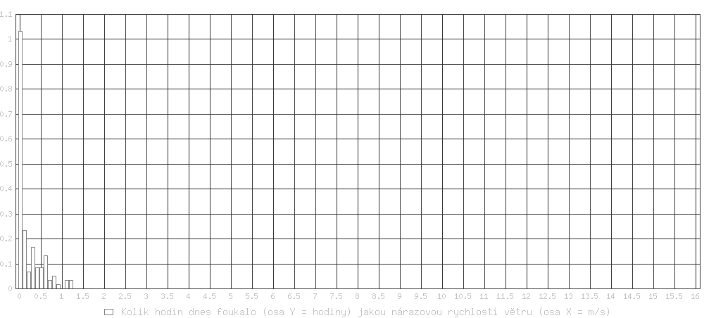 Průměrná rychlost větru za poslední minutu byla 0 m/s Dnes nárazy větru od 0.00 m/s (0 km/h) do 1.22 m/s (4.3 km/h)