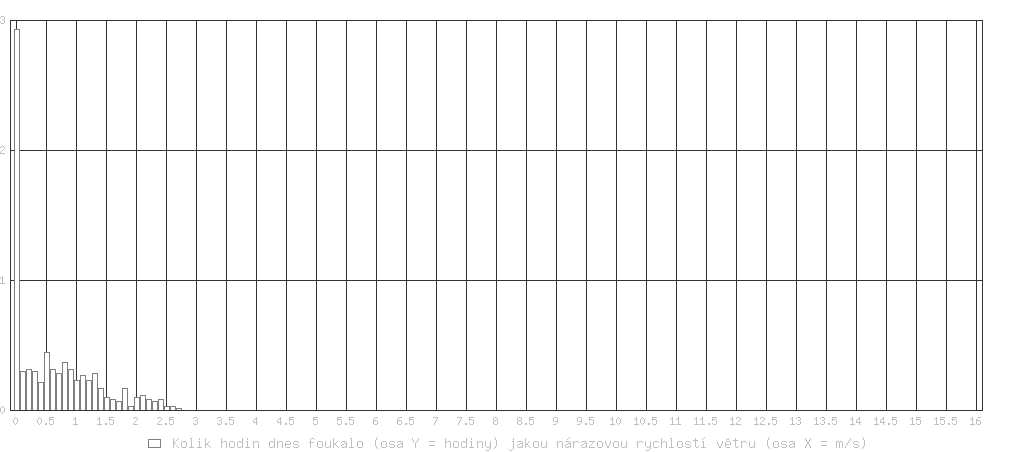 Průměrná rychlost větru za poslední minutu byla 0.5 m/s Dnes nárazy větru od 0.00 m/s (0 km/h) do 2.73 m/s (9.8 km/h)