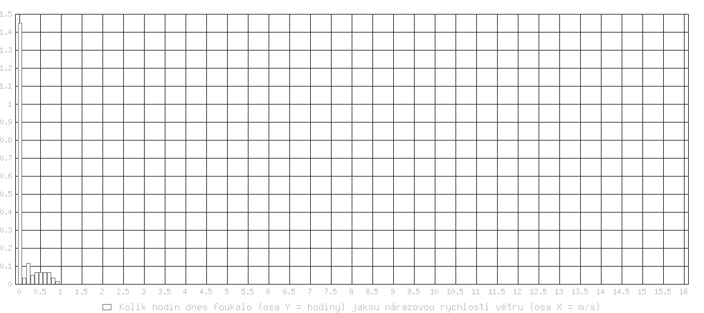 Průměrná rychlost větru za poslední minutu byla 0.4 m/s Dnes nárazy větru od 0.00 m/s (0 km/h) do 5.09 m/s (18.3 km/h)