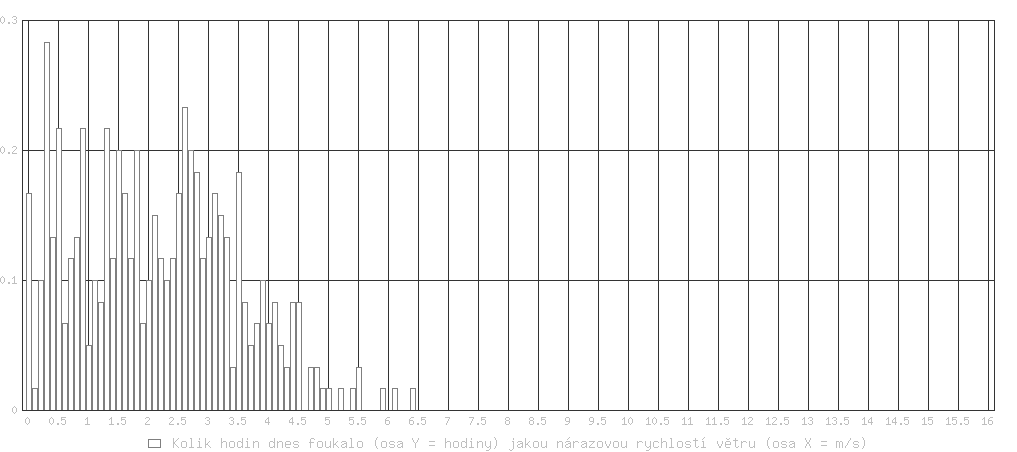 Průměrná rychlost větru za poslední minutu byla 1.1 m/s Dnes nárazy větru od 0.00 m/s (0 km/h) do 2.62 m/s (9.4 km/h)