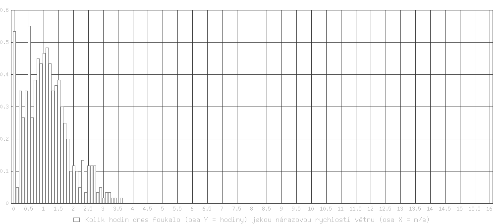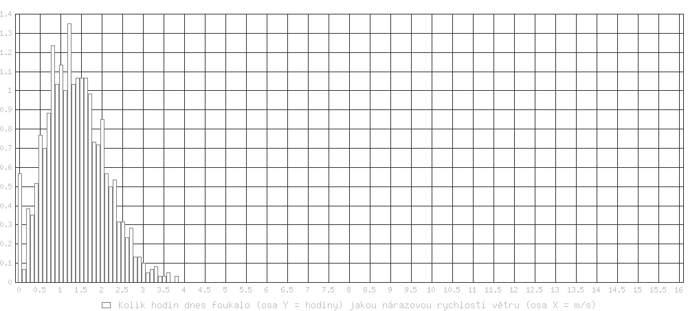 Průměrná rychlost větru za poslední minutu byla 0.8 m/s Dnes nárazy větru od 0.00 m/s (0 km/h) do 3.61 m/s (12.9 km/h)