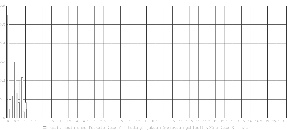 Průměrná rychlost větru za poslední minutu byla 0.3 m/s Dnes nárazy větru od 0.00 m/s (0 km/h) do 0.80 m/s (2.8 km/h)